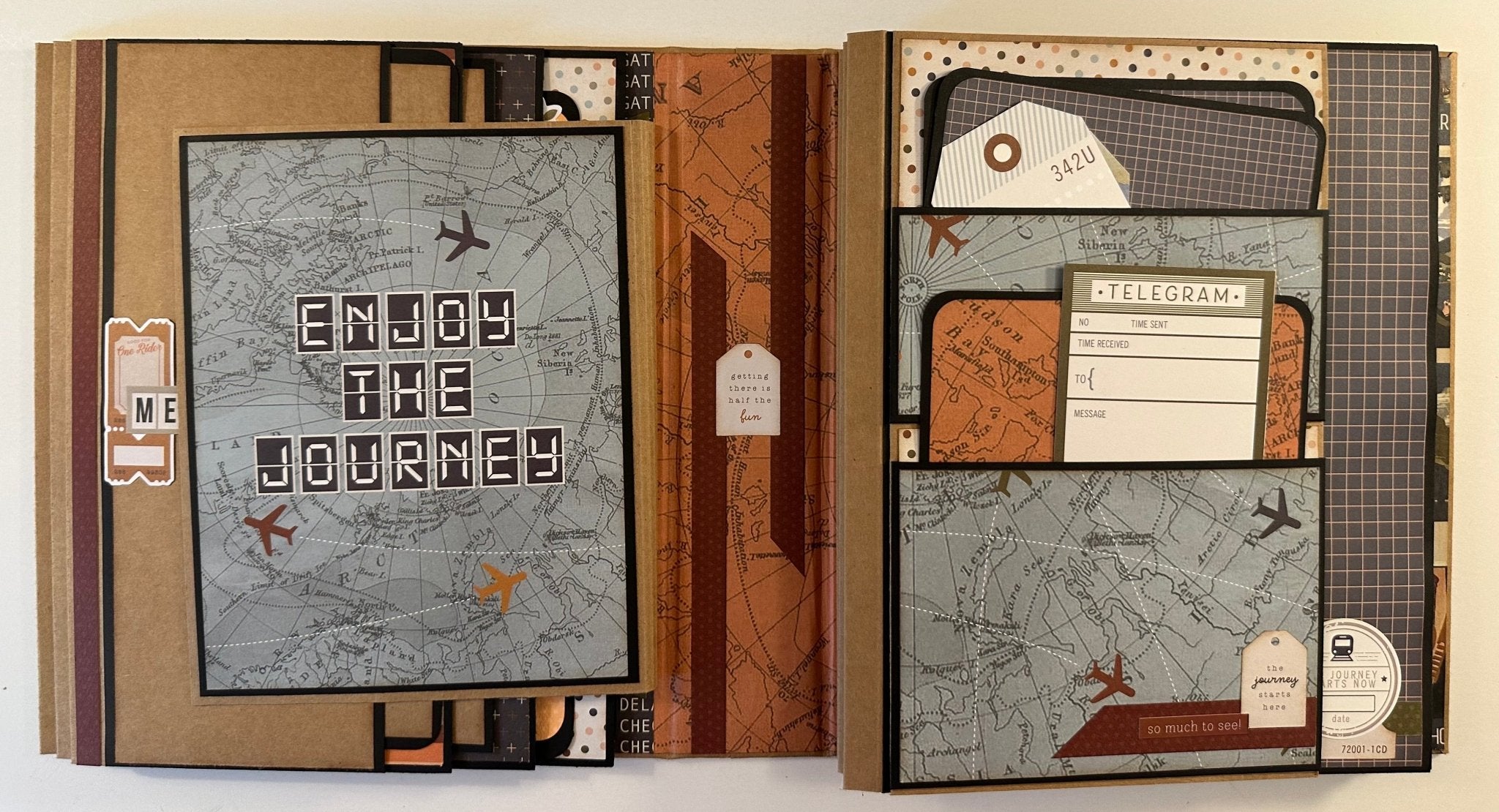 I decorated this folio album with the Here & There collection by Simple Stories collection. I used Black and Kraft colored cardstock to construct this folio album.